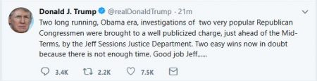 (Sep. 3, 2018) — At mid-afternoon on Monday, President Donald Trump issued two tweets, one a continuation of the other, again be rating his attorney general, Jeff Sessions, for pursuing charges against “two very popular Republican Congressmen.”