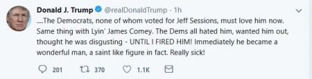 Trump claimed that the Democrats then underwent a change of heart toward Comey. “Immediately he became a wonderful man, a saint like figure in fact. Really sick!” Trump tweeted exasperatedly. [sic]
