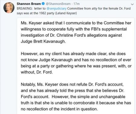 The three “witnesses” Ford identified through her attorneys prior to her Thursday testimony to the Judiciary Committee have all said in statements through their respective attorneys that they have no recollection of having attended such a gathering. Keyser stated that she does not dispute Ford’s allegation but is not acquainted with Kavanaugh and does not recall having attended any gathering with him where Dr. Ford was or was not present.