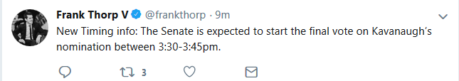 (Oct. 6, 2018) — At approximately 1:20 PM EDT Saturday, NBC News’s Frank Thorpe V tweeted that the U.S. Senate’s final vote on the nomination of Judge Brett Kavanaugh to the U.S. Supreme Court will occur between approximately 3:30 PM and 3:45 PM.