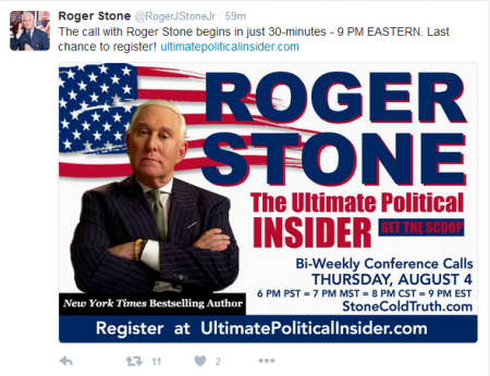 The calls were promoted by Stone on Twitter as a place where interested parties could “get the scoop” on the Trump campaign from “The Ultimate Political Insider.”