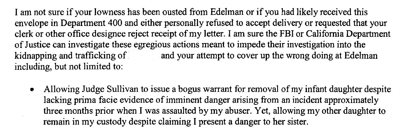 Unable to verify the origin of the Termination order or why she had not been made aware of it through normal judicial channels, in May Robinson reached out to the Los Angeles office of the FBI by phone. She described their response as courteous. The following month, Robinson followed up by sending the FBI a five-page letter, and copies to California Attorney General Xavier Becerra, the Edelman Court, the California Commission on Judicial Performance, and this publication.