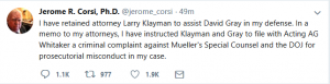 Spread the love“SILENT NO MORE” by Sharon Rondeau (Nov. 28, 2018) — In a tweet on Wednesday afternoon, Jerome Corsi, who rejected a plea deal on Monday offered by Special Counsel Robert Mueller, tweeted that he hired well-known attorney Larry Klayman to join his present counsel, David Gray, with the intent to file a criminal … Continue reading Breaking: Corsi Hires Klayman, Prepares to File Criminal Complaint Against Mueller