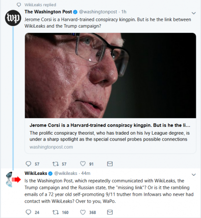 In response to The Post‘s tweeting of its article, WikiLeaks tweeted, “Is the Washington Post, which repeatedly communicated with WikiLeaks, the Trump campaign and the Russian state, the ‘missing link’? Or is it the rambling emails of a 72 year old self-promoting 9/11 truther from Infowars who never had contact with WikiLeaks? Over to you, WaPo.”