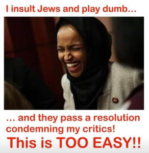 Yet, the Jew-haters plod ahead, as we can see by the new Sludge Sisters in the U.S. Congress––Rep. Ilhan Omar (D-MN) and Rep. Rashida Tlaib (D-MI)––and their sycophantic supporters, including Speaker of the House Nancy Pelosi, who is so intimidated by these far-left racists that she has rewarded them with influential positions on House committees.