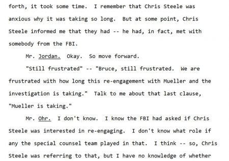 On page 209 of the transcript of Ohr’s closed-door congressional testimony on August 28, 2018, Ohr explained that he and Steele, who had frequent contact in 2016 and 2017 by text and phone, discussed Ohr’s facilitating a “re-engagement” between Steele and the FBI and Steele and the Mueller team.