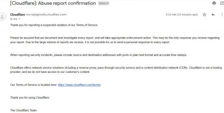 We called Cloudflare, whose phone messaging system said it does not accept “Abuse” reports by voice and referred us to an online form.