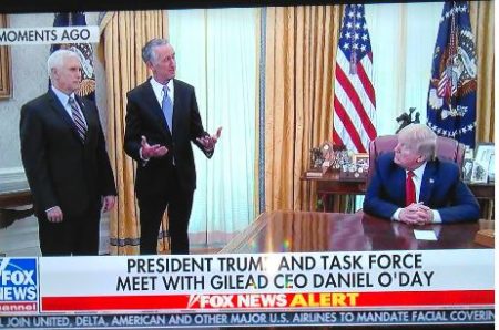 (May 1, 2020) — At approximately 4:00 p.m. on Friday, President Trump spoke from the Oval Office about Remdesivir as a promising treatment for coronavirus, introducing Gilead Sciences CEO Daniel O’Day to provide details about the drug’s use during the U.S. pandemic.