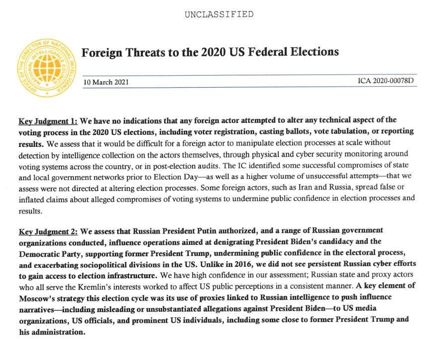 The first “Key Judgment” in the ICA states, “We have no indications that any foreign actor attempted to alter any technical aspect of the voting process in the 2020 US elections, including voter registration, casting ballots, vote tabulation, or reporting results. We assess that it would be difficult for a foreign actor to manipulate election processes at scale without detection by intelligence collection on the actors themselves, through physical and cyber security monitoring around voting systems across the country, or in post-election audits…”