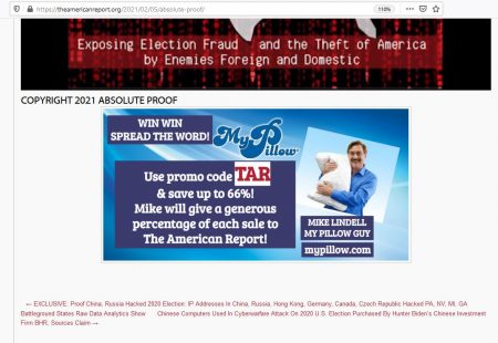 Without explaining his earlier erroneous prognostications, Lindell in early February co-produced, along with Fanning, Jones and Brandon Howse of WVW-TV, a two-hour video titled, “Absolute Proof” claiming to present conclusive evidence as to how the election was “stolen” from Trump. During the video’s last 24 minutes, Fanning relates her narrative of vote-switching allegedly perpetrated by from China, Russia, Pakistan, Iran, Iraq and other nations, to which Lindell gave obvious credence as the overarching explanation of the presidential election results.