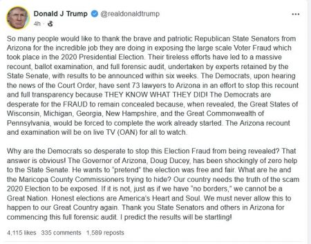(Apr. 23, 2021) — On Friday evening, a statement apparently sent by the office of 45th President of the United States Donald J. Trump appeared on the social-media platform Gab.com predicting that the audit of the November 3, 2020 election launched in Maricopa County, AZ earlier Friday will yield evidence of voter fraud.