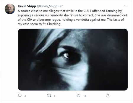 On July 25, former CIA officer Kevin Shipp tweeted a surprising revelation: “A source close to me alleges that while in the CIA, I offended Fanning by exposing a serious vulnerability she refuse to correct. She was drummed out of the CIA and became rogue, holding a vendetta against me. The facts of my case seem to fit. Checking.”