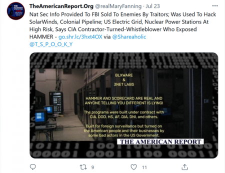 In addition to the election, Fanning and Jones’s list of alleged uses of The Hammer has grown to include such current news events as the trial of Lt. Gen. Michael T. Flynn (Ret); the Hunter Biden laptop containing what appeared to be incriminating information about Joe Biden’s profiting from China, Ukraine and other countries while he served as the nation’s vice president; the January 6 incursion of the U.S. Capitol; and the SolarWinds and Colonial Pipeline “hacks.”
