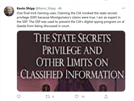 Later that day, Shipp added, “One final trick Fanning uses: Claiming the CIA invoked the state secrets privilege (SSP) because Montgomery’s claims were true. I am an expert in the SSP. The SSP was used to prevent the CIA’s digital spying program on al Qaeda from being discussed in court.”