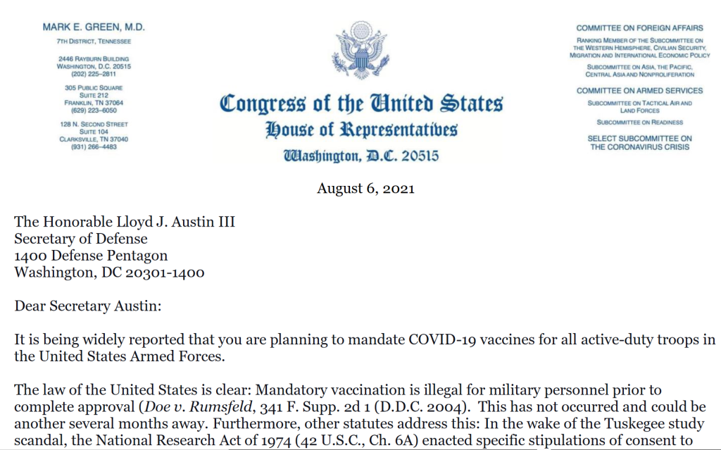Several members of the House of Representatives, including six who are medically-licensed, brought to Austin’s attention the fact that, until full FDA approval of the experimental fluids is announced, mandatory vaccinations of military personnel are illegal, citing Doe v. Rumsfeld, 341 F.Supp.2d 1 (D.D.C. 2004).