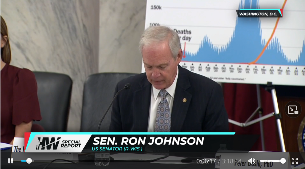 (Nov. 4, 2021) — In a 3+-hour hearing on Monday in Washington, DC, U.S. Sen. Ron Johnson (R-WI) said that U.S. government agencies tasked with safeguarding the nation’s health and steering it through the coronavirus pandemic both “sabotaged early treatment” and lied about the safety and efficacy of the vaccines administered throughout the country since last December.