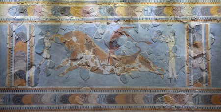 What we know about Minoan civilization is from its art – and it seems a bit too good to be true. Is this indeed the legendary Atlantis? An idyllic land of luxury, peace, and beauty, where toreadors (male and female) vaulted over bulls instead of killing them. Unfortunately, we can’t read Linear A. So what do the exposed breasts mean? The religion of Crete may have developed from some form of fetishism. Four symbols predominate: the pillar, the double axe, the shield, and the sacred tree. There is an affinity with the Great Mother goddesses of Mesopotamia, except that Crete emphasized motherhood (hence breasts?) while the Canaanites emphasized sex to make the crops grow. Secondary to the goddess was her male counterpart, Minotaur, the man-bull – hence the bull dancing.