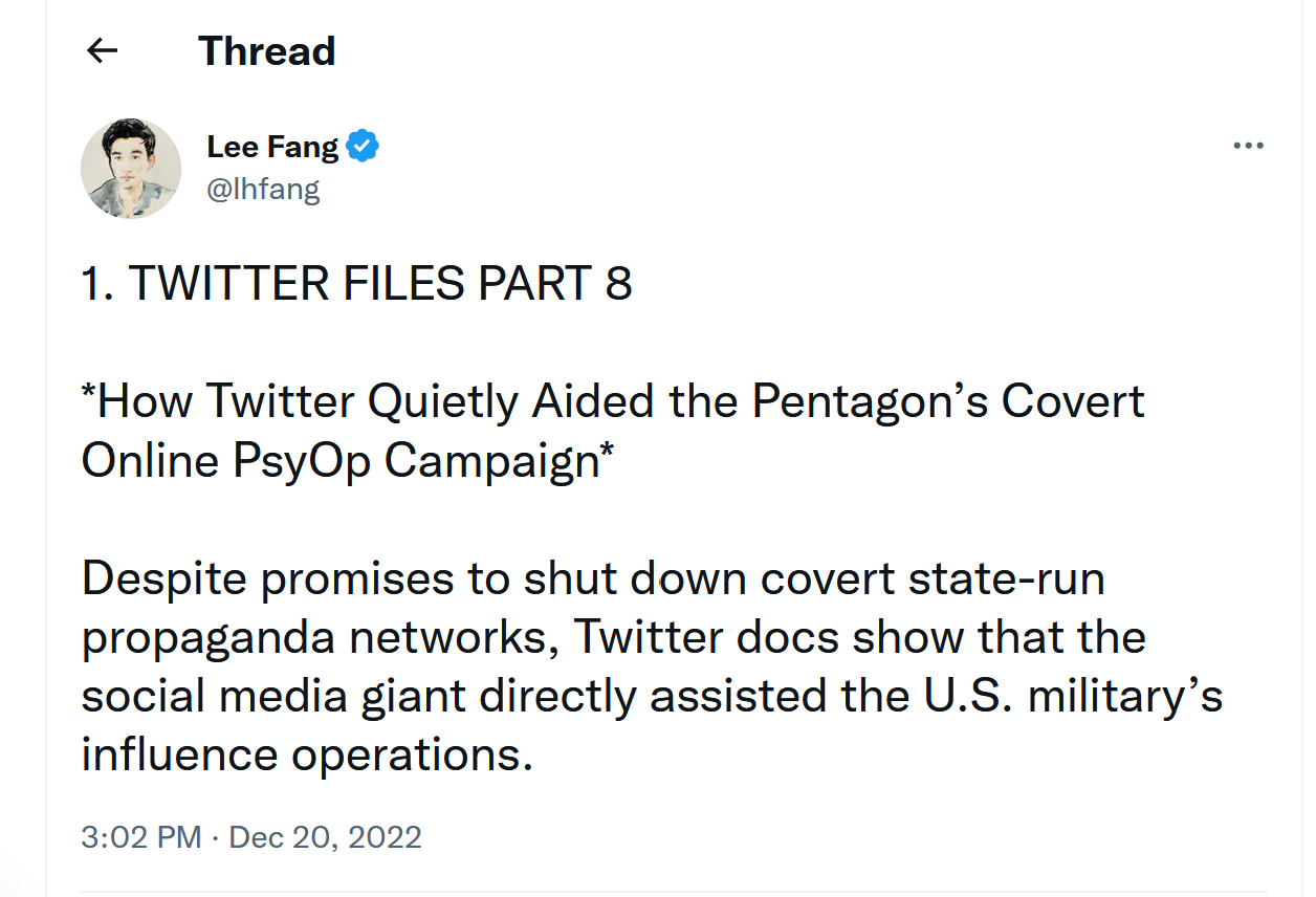 Fang titled the release, “How Twitter Quietly Aided the Pentagon’s Covert Online PsyOp Campaign.” The narrative begins, “Despite promises to shut down covert state-run propaganda networks, Twitter docs show that the social media giant directly assisted the U.S. military’s influence operations.”