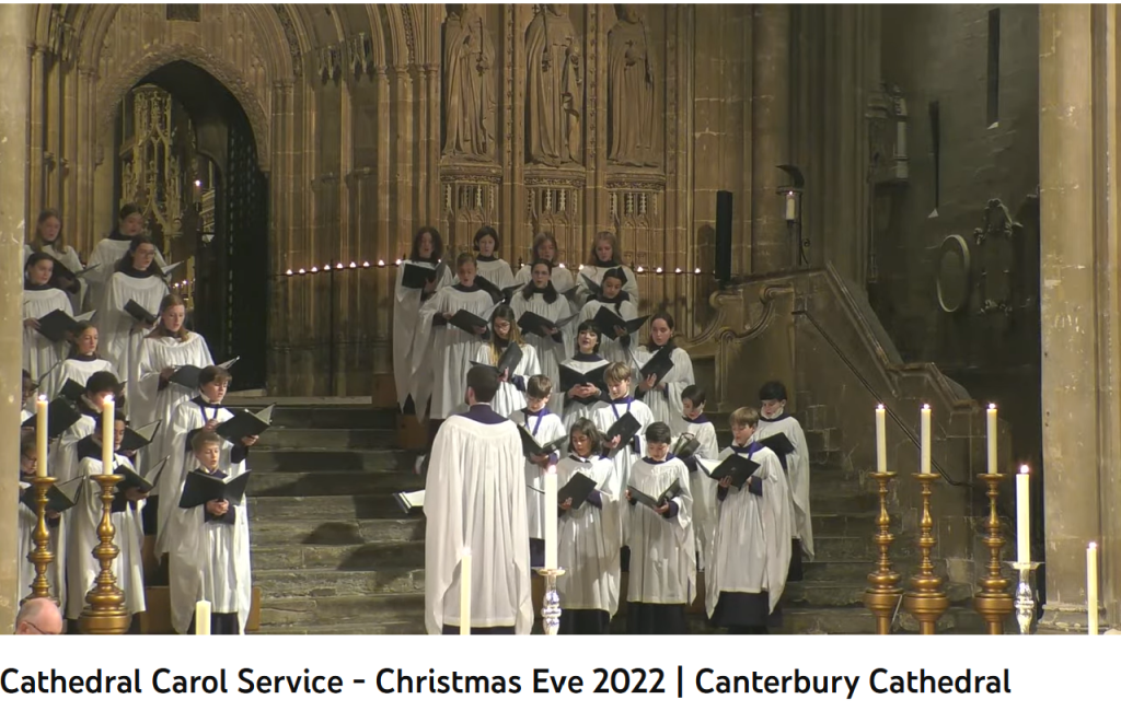 (Dec. 24, 2022) — “England’s First Cathedral,” the Canterbury Cathedral, as of 10:41 a.m. EST is giving a live Christmas Eve service with participation by its “world-famous” choir, which includes young voices as well as those of adults.