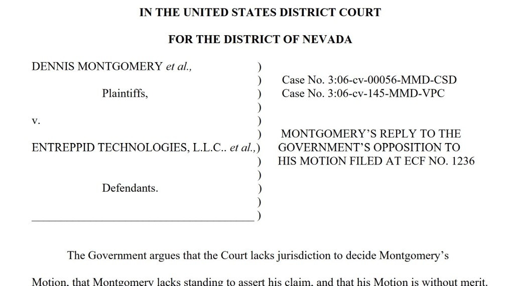Montgomery’s newest filing in the reopened eTreppid case begins with, “The Government argues that the Court lacks jurisdiction to decide Montgomery’s Motion, that Montgomery lacks standing to assert his claim, and that his Motion is without merit. None of these arguments are viable.”