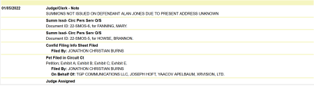 A docket entry in the case dated April 22, 2022 notes a filing of a “Notice of Hearing of their Motions to Compel and to Strike and of Defendant Fannings Motion for Continuance” by plaintiffs’ attorney Jonathon Christian Burns and a “Motion to Compel and Motion to Strike” with seven exhibits, the last being “Evidence of Gregg Kirchhoefers Fax Number.”