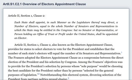 Some comments about the true purpose of the Electoral College. Unfortunately the major politically parties over the years have put into place in many states statutory laws mandating how the Electors from that state must vote (per said laws) which end up trumping their Oath to the Constitution to support and defend the Constitution. The political parties consider the Oath of Office taken by the Electors as nothing but ritual and the Electors are told to obey the state laws controlling how they must vote … or else! They are no longer being allowed to carry out their constitutional oath and duties as originally intended per the Constitution as described in the Federalist Papers, and are under threat of individual and personal legal penalties, and/or removal from office, if they try to act on behalf of defending the Constitution as the supreme law of the land. If the Electoral College was allowed to act as originally intended as a stop-check against constitutional mistakes made by the political parties misleading people in the popular vote by voting for and selecting someone who is NOT constitutionally eligible, the Electors would stop things right then and there in that constitutional body and process when it convened, insuring that only a constitutionally eligible candidate is “elected” by the Electors and forwarded to the Congress for its confirmation action, and if necessary demand and call for a new election to provide to the College for consideration only a constitutionally eligible candidate(s), to allow the people and political parties to right their constitutional wrong. But the Electoral College today is now totally ineffective and hamstrung by the political parties and laws they have had put in place in 27 states and it is now nothing more than a rubber stamp of the election results and candidates, no matter how constitutionally flawed those politically-party-endorsed candidates and election results may be. We are being governed by the Political Parties, not the U.S. Constitution in this and many other areas. See these articles about the Electoral College for more information: