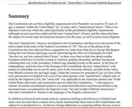 “Having endorsed these conclusions, I must concede that the picture is clouded by elements of doubt. These doubts will unquestionably persist until they are eliminated by a constitutional amendment, a definitive judicial decision, or the election and accession of a President who was “natural-born” outside the United States. The withdrawal of Governor Romney has ended the possibility that clarification would emerge as a result of his candidacy. Perhaps such clarification will develop from some future candidacy of another citizen in the same situation [e.g., Ted Cruz]. On the other hand, it may eventually be necessary to amend the Constitution in order to remove the ambiguity. It is unfortunate that doubts remain on an issue of such vital importance to many Americans.” (Emphasis added).