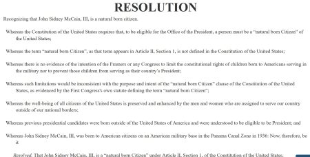 The 2014 edition then claims that the “debate” ended, as a practical matter, when in 2008, the U.S. Senate passed S.Res. 511, purporting to “deem” Senator John McCain eligible to the presidency. As discussed here, that non-binding resolution, expressing only the “sense” or “opinion” of the Senate, rather than constituting a substantive “law,” was based in large part on the mistaken belief that 1 Stat. 103 was still controlling law…, 213 years after it had been repealed.