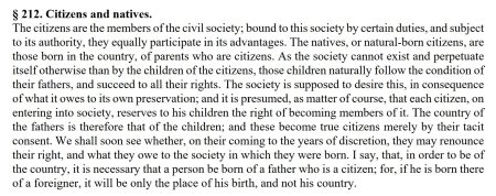 Here is the key sentence and definition from that legal treatise on the Laws of Nature and Natural Law by Vattel: https://cdrkerchner.wordpress.com/2023/04/15/my-translation-of-a-key-sentence-in-emer-de-vattels-1758-treatise-on-natural-law-in-section-212-des-citoyens-et-naturels/