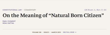 The article appeared in the Harvard Law Review Forum – a periodical not to be confused with the Harvard Law Review Journal published by the law school – at a time corresponding to the March 23, 2015 announcement by Senator Ted Cruz (R. TX) that he would be a candidate for the GOP nomination for president in the 2016 primary. Unsurprisingly, the article concluded that Sen. Cruz was eligible as a “natural born Citizen” (“nbC”) under Art. 2, § 1, Cl. 5 of the Constitution.