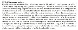 Interestingly, in the “open source” entry for the Minor decision found at en.Wikipedia.org, footnote 13 states as to the Court’s comment regarding the definition of an nbC that the Court was “paraphrasing Emerich de Vattel, The Law of Nations, book I, chapter XIX, section 212.” This is a significant, albeit non-judicial and non-precedential observation, because it specifically acknowledges that the definition of an nbC as adopted by the Court was the one which, “[a]t common-law, with the nomenclature of which the framers of the Constitution were familiar…,” was most likely directly traceable to § 212.