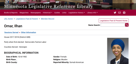 An archived page from Omar’s state legislative website as captured by the Minnesota Legislative Reference Library as well as an updated page bear out Kern’s claims, which are also supported by confirmation of the change request received by MLRL staff from Omar’s congressional office.