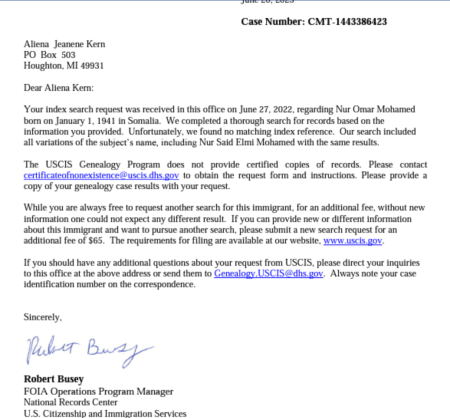 “We completed a thorough search for records based on the information you provided,” Robert Busey, USCIS FOIA Operations Program Manager wrote. “Unfortunately, we found no matching index reference. Our research included all variations of the subject’s name, including Nur Said Elmi Mohamed with the same results.”
