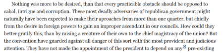 Hamilton warned that the potential for such foreign influence danger arose “chiefly from the desire in foreign powers to gain an improper ascendant in our councils. How could they better gratify this, than by raising a creature of their own to the chief magistracy of the union?” (Emphasis added). Reduced to its essence, the Founders’ objective was to shield and vigorously protect from the outset the “chief magistracy” from that danger.