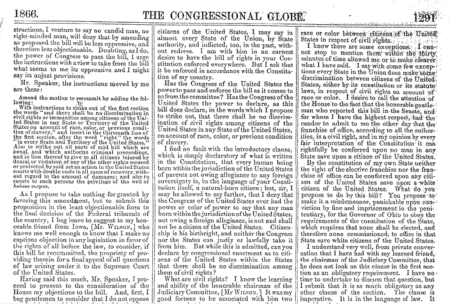 Then, some four years later, on March 9, 1866, less than one year following the end of the Civil War, Bingham rose again on the floor of the House. This time he addressed his assembled colleagues on a Senate bill (S. 61) entitled “An act to protect all persons in the United States in their civil rights and furnish the means of their vindication” forwarded to the House for action. Congressman Bingham again articulated his recognition of the distinction between “citizens” and “natural born citizens” thusly: