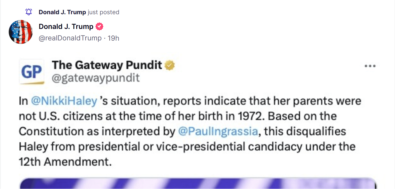 As interest continues to once again pick up in the presidential eligibility issue following President Trump’s post suggesting that Nikki Haley might not be a “natural born Citizen” (“nbC”), and thus ineligible, some interesting reactions and observations have surfaced. In this offering, your humble servant will address some of those new items. And reader fair warning alert: this post is long…., but, if you have gotten this far past the title, arguably well worth reading.