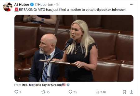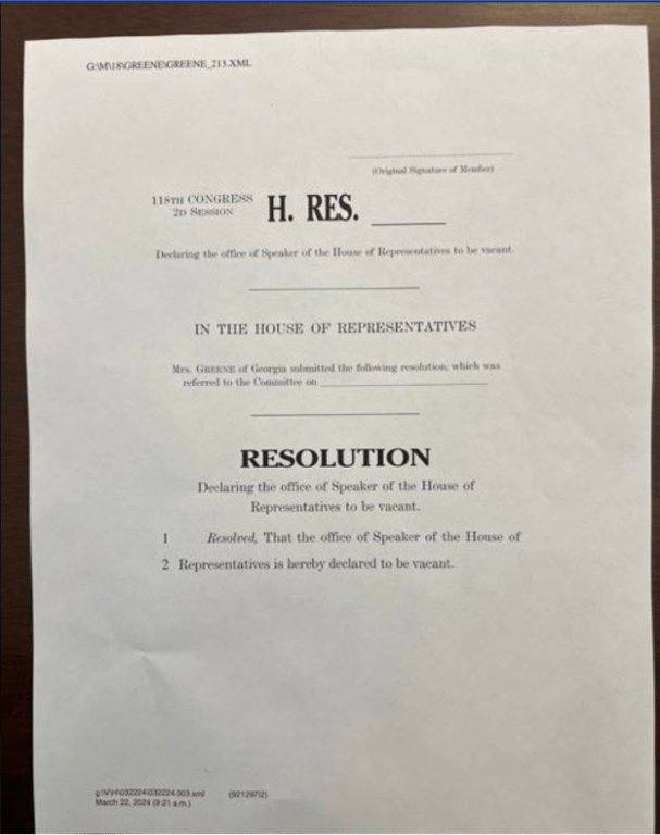 (Mar. 22, 2024) — Rep. Marjorie Taylor Greene (R-GA14) submitted a Resolution “Declaring the office of Speaker of the House of Representatives to be vacant” following the chamber’s passage of a $1.2 trillion appropriations bill approximately 12 hours before certain parts of the federal government would have closed for lack of funding.