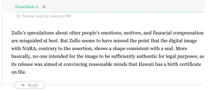 “Zullo’s speculations about other people’s emotions, motives, and financial compensation are misguided at best,” “Johnathan J” wrote on Tuesday. “But Zullo seems to have missed the point that the digital image with NARA, contrary to the assertion, shows a shape consistent with a seal. More basically, no one intended for the image to be sufficiently authentic for legal purposes, as its release was aimed at convincing reasonable minds that Hawaii has a birth certificate on file.” [Emphasis The Post & Email‘s]