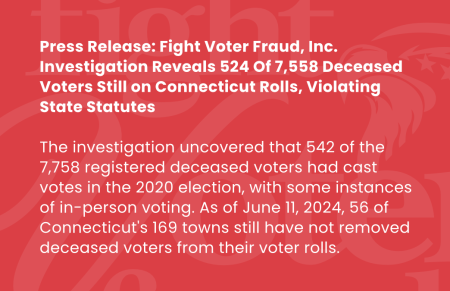 (Jul. 31, 2024) — Middletown, CT, July 30, 2024 — Between July 12, 2022, and May 15, 2024, Fight Voter Fraud, Inc. (FVF, Inc.) investigated the presence of deceased individuals on Connecticut’s voter rolls from November 2020. FVF, Inc. identified and documented each registered deceased voter, providing this evidence to the Registrar of Voters via certified mail. The investigation uncovered that out of 7,758 registered deceased voters, 542 had cast votes in the 2020 election, with some instances of in-person voting. As of June 11, 2024, 56 out of Connecticut’s 169 towns still have not removed deceased voters from their voter rolls, according to the updated data purchased by Fight Voter Fraud, Inc. from the State of Connecticut.