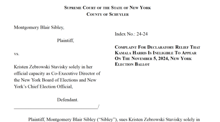 (Sep. 2, 2024) — On August 26, Schuyler County, NY resident and registered voter Montgomery Blair Sibley uploaded his “Complaint for Declaratory Relief” filed August 12 in New York Supreme Court naming as defendant Kristen Zebrowski Stavisky “solely in her official capacity as Co-Executive Director of the New York Board of Elections and New York’s Chief Election Official.”