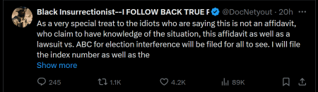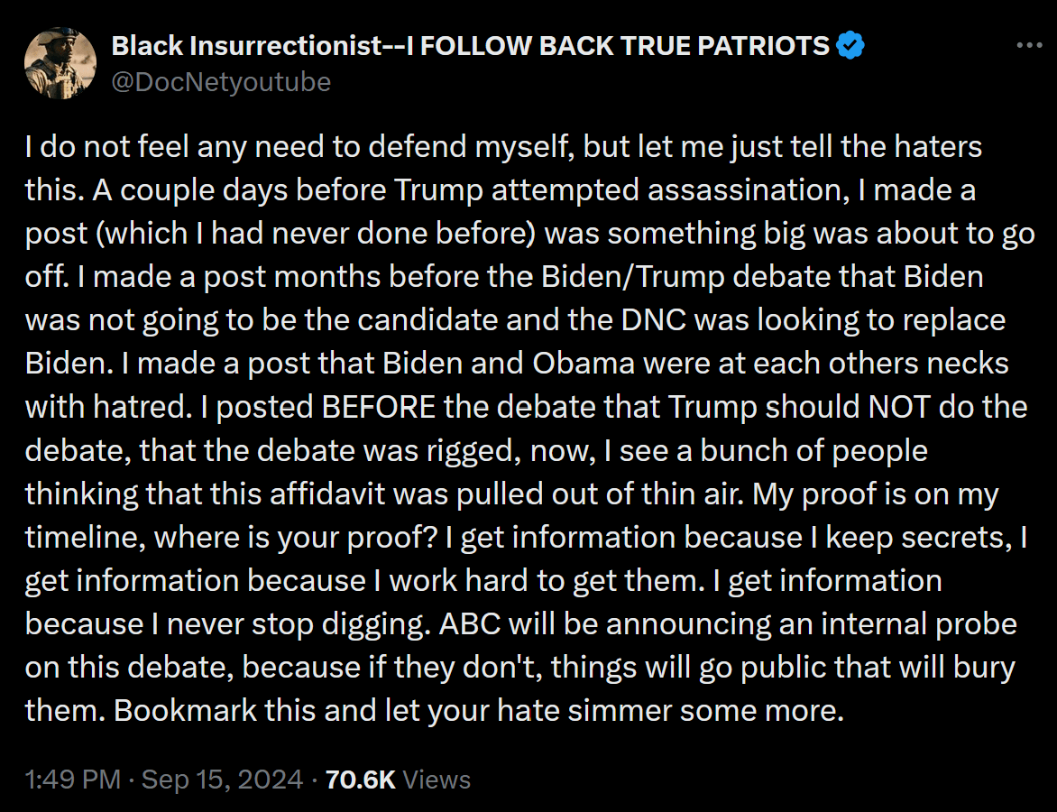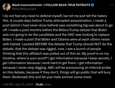 (Sep. 16, 2024) — Following his release on Sunday of a “whistleblower” affidavit appearing to come from an ABC News employee, “Black Insurrectionist” predicted on his “X” account that the outlet will open an “internal investigation” into the events leading up to the September 10 debate between Republican presidential nominee and 45th President Donald J. Trump and Democrat nominee Kamala Harris, the sitting vice president.