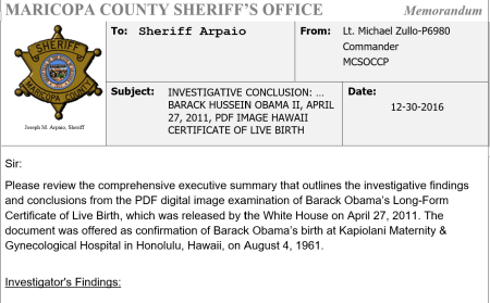 The Post & Email can report exclusively that on December 30, 2016, Zullo sent a never-before-seen memo to Arpaio detailing the conclusions of the experts Zullo revealed at the presser two weeks earlier.