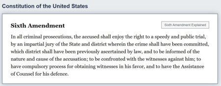 The 6th Amendment states: “In all criminal prosecutions, the accused shall enjoy the right to a speedy and public trial, by an impartial jury of the State and district wherein the crime shall have been committed… and to have compulsory process for obtaining witnesses in his favor, and to have the Assistance of Counsel for his defense.”