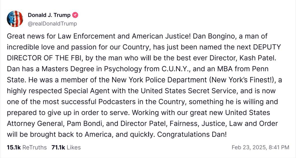 (Feb. 23, 2025) — At 8:41 PM EST, President Donald Trump announced broadcaster, author, former Secret Service agent and former NYPD officer Dan Bongino as the next deputy director of the Federal Bureau of Investigation (FBI).