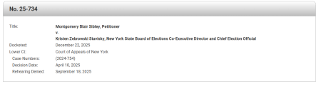 The New York Court of Appeals finally issued on September 18, 2025, their Order denying my motion for rehearing. No surprise there. According, I have filed a Petition for Certiorari at the U.S. Supreme Court which was docketed on December 22, 2025. The Petition and Appendix can be found on my website. I presented two questions to SCOTUS: