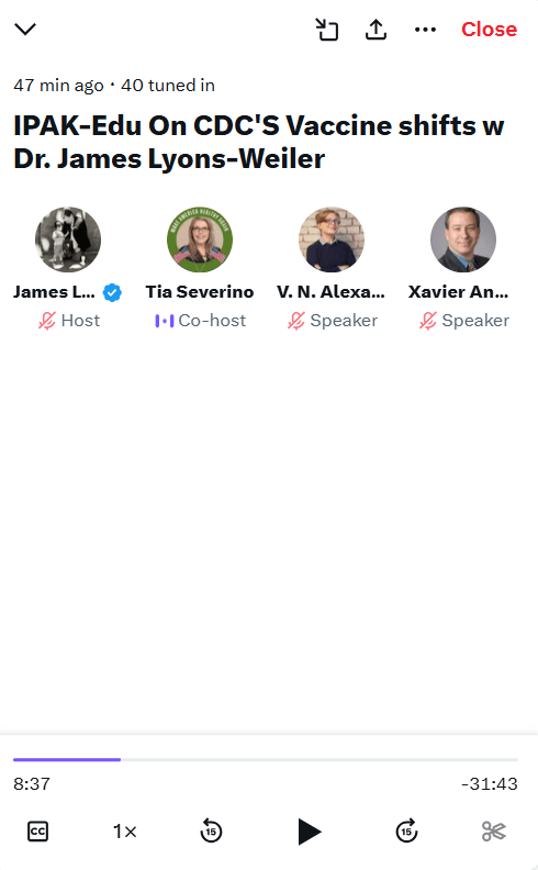 (Jan. 6, 2026) — On Tuesday afternoon, scientist, copious writer, founder of the Substack “Popular Rationalism” and the IPAK-EDU online school James Lyons-Weiler, PhD launched an inaugural X “Spaces” broadcast to discuss current issues of the day.