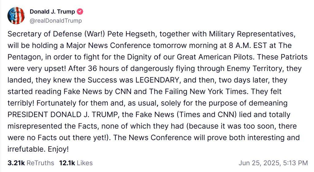 by Sharon Rondeau https://truthsocial.com/@realDonaldTrump/posts/114746066225069169 (Jun. 25, 2025) — In a post time-stamped 5:13 PM EDT, President Donald Trump announced a Department of Defense press conference will commence at 8:00 a.m. Thursday morning, the second since U.S. bombers dropped B-2s on three Iranian nuclear sites Saturday night in “Operation Midnight Hammer.” Trump, the Israeli government and […]