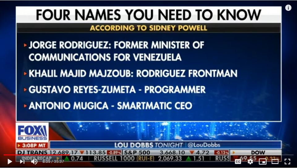 by Sharon Rondeau https://www.youtube.com/watch?v=jpvZFMeI5M4&feature=youtu.be (Dec. 11, 2020) —In an interview with Fox Business host Lou Dobbs Thursday night, Attorney Sidney Powell, who is not a member of the Trump legal team, said she and her group have acquired “documentation” clearly demonstrating that four individuals associated with Dominion Voting Systems (DVS), Smartmatic and the government of […]