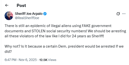 by Sharon Rondeau https://x.com/RealSheriffJoe/status/1986581330055065731 (Nov. 7, 2025) — On Thursday evening, former Maricopa County, AZ Sheriff Joseph Arpaio wrote on X that despite the considerable number of deportations and arrests of illegal aliens, particularly those having committed violent crimes, an “epidemic” persists in which illegals are “using FAKE government documents and STOLEN social security numbers!” […]