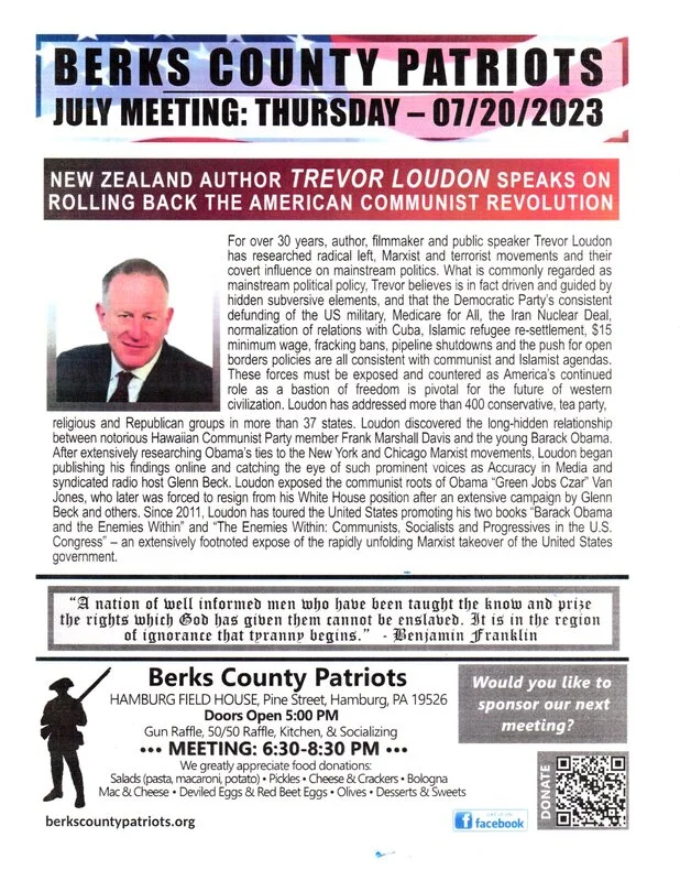 by CDR Charles F. Kerchner, Jr. (Ret), blogging at CDR Kerchner, ©2023 Click on image for more information about Trevor Loudon and his published literary and film works. (Jul. 16, 2023) — Date: Thursday 20 Jul 2023. Location: Berks County Patriots Meeting – Hamburg Field House, Pine Street, Hamburg, PA 19526. Doors Open 5:00 PM […]
